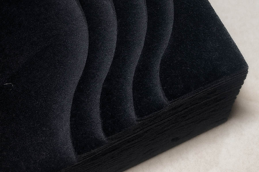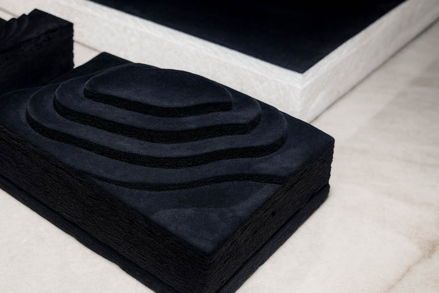Flocktechniek – C\&B Innovations, med lång industriell flockningsexpertis, applicerade ytan med sin elektrostatiska fiberteknologi. Deras maskiner och tekniska kunnande gjorde det möjligt att uppnå en konsekvent och premium taktil effekt på ett cellulosabaserat skum.