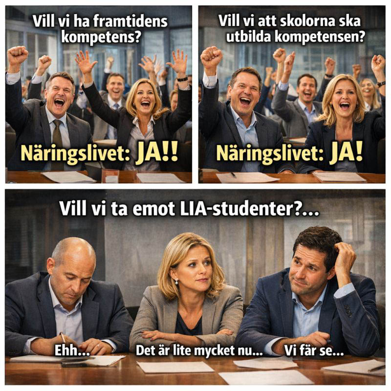 Kompetens är alltid efterfrågad i industrin. Tyvärr finns det en kompetensbrist. De förpackningsutbildningar som finns på Yrkeshögskolenivå är en bra lösning inför framtiden, men för att det ska fungera krävs det att industrin verkligen ställer upp och ser till att utbildningen går att genomföra. Bristen på LIA-platser (Lära i arbete) är ett ständigt problem. Den här bilden dök upp på LinkedIn nyligen och kan väl sägas sammafatta läget ganska bra.