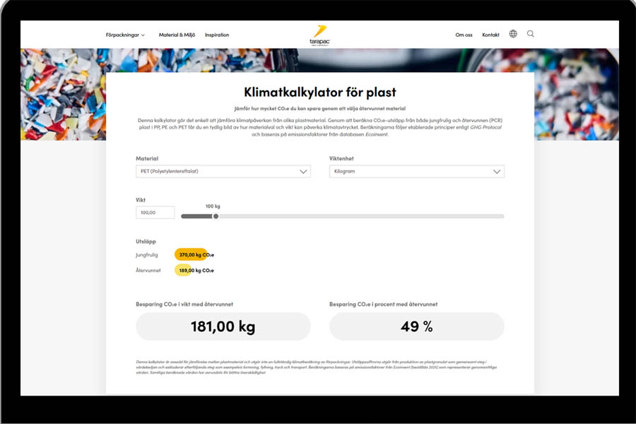 Tara Pac lanserar nu en klimatkalkylator som gör det smidigt att jämföra utsläppsnivåer av olika typer av plastmaterial. Via den är det enkelt att se hur materialvalet påverkar klimatavtrycket. Hur påverkas avtrycket av att man använder ny eller återvunnen PE, PP eller PET?